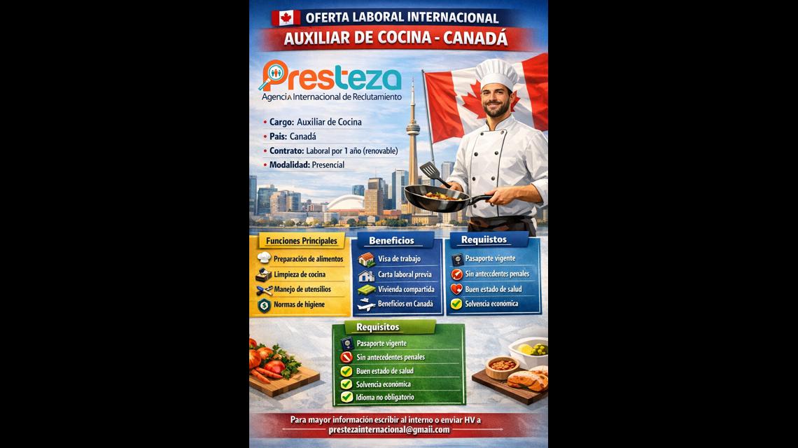 🇨🇦 OFERTA LABORAL INTERNACIONAL – AUXILIAR DE COCINA – CANADÁ